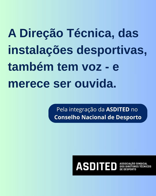 A ASDITED – Associação Sindical dos Diretores Técnicos de Desporto – reafirma o seu pedido de integração no Conselho Nacional do Desporto (CND), órgão consultivo do Governo responsável por acompanhar e avaliar as políticas públicas do desporto em Portugal.